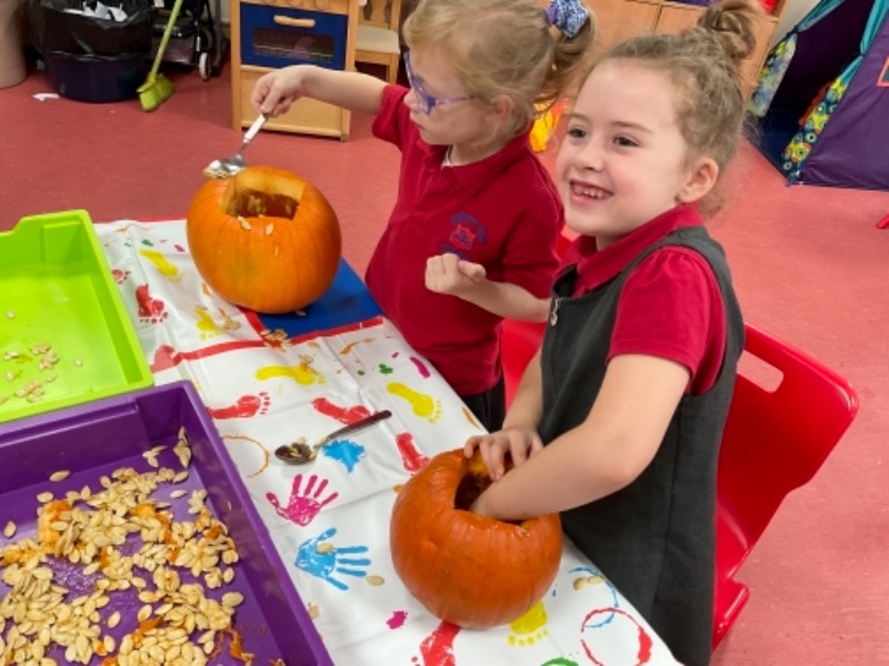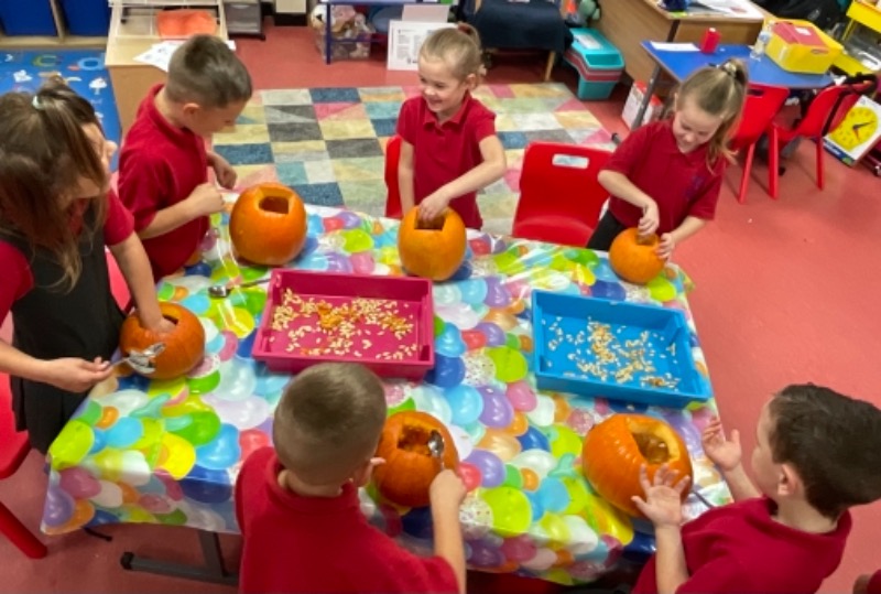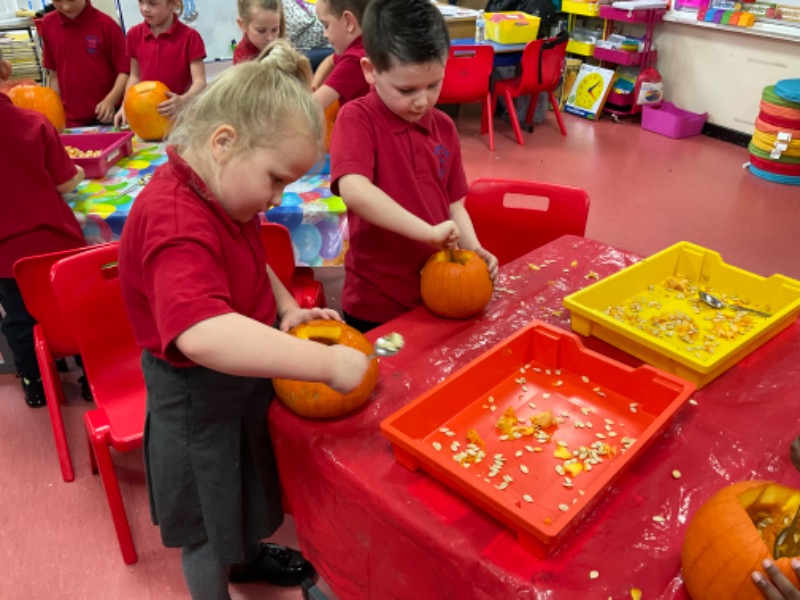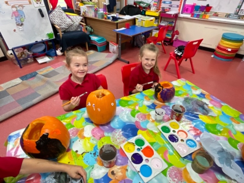 P2/3 were using pumpkins to inspire their learning today. In maths, they used counters, cubes and paper clips to measure the pumpkins. They then used their senses to explore the pumpkins and enjoyed taking the insides out using their hands and spoons. Finally, they enjoyed painting their pumpkins this afternoon.