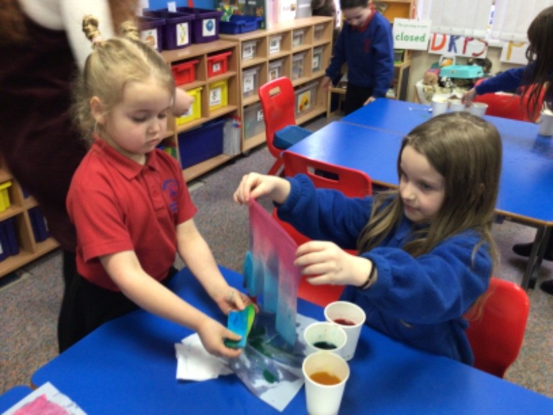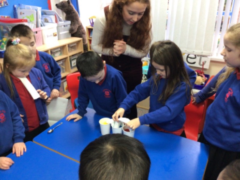 Our student teacher, Miss Dunbar, did a science experiment with the class. We investigated how to make new colours using the primary colours. We all had so much fun.
