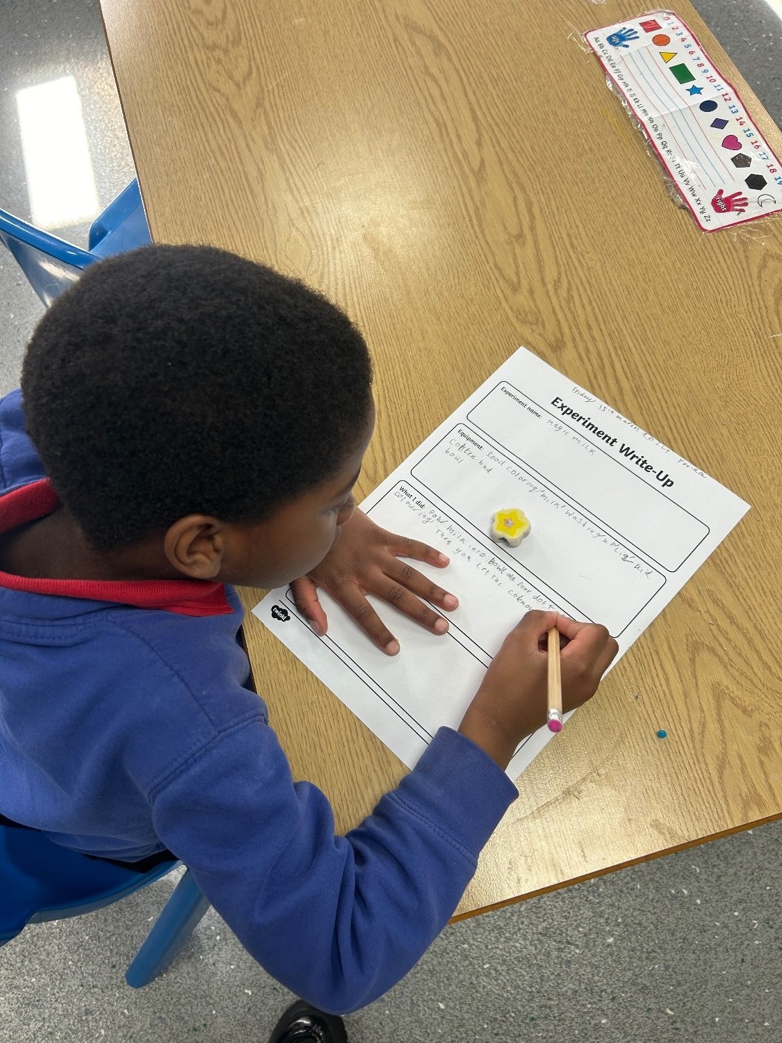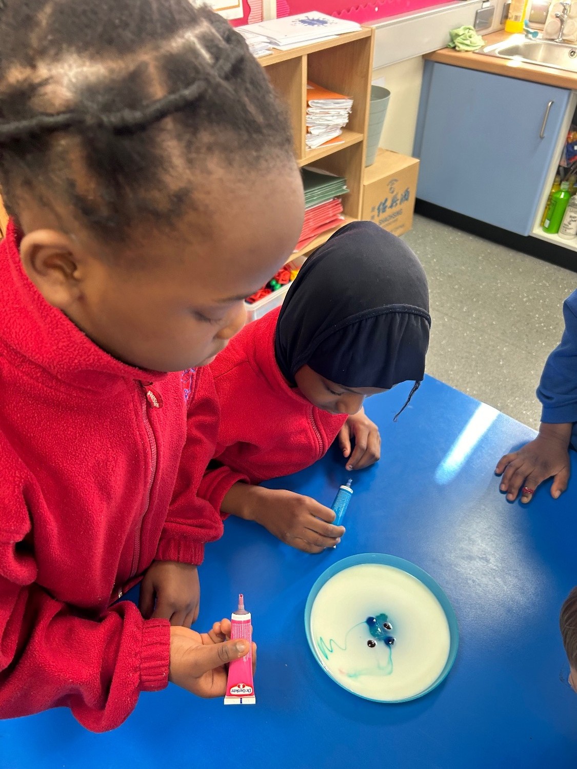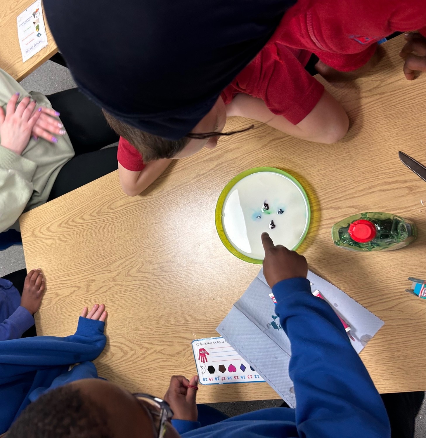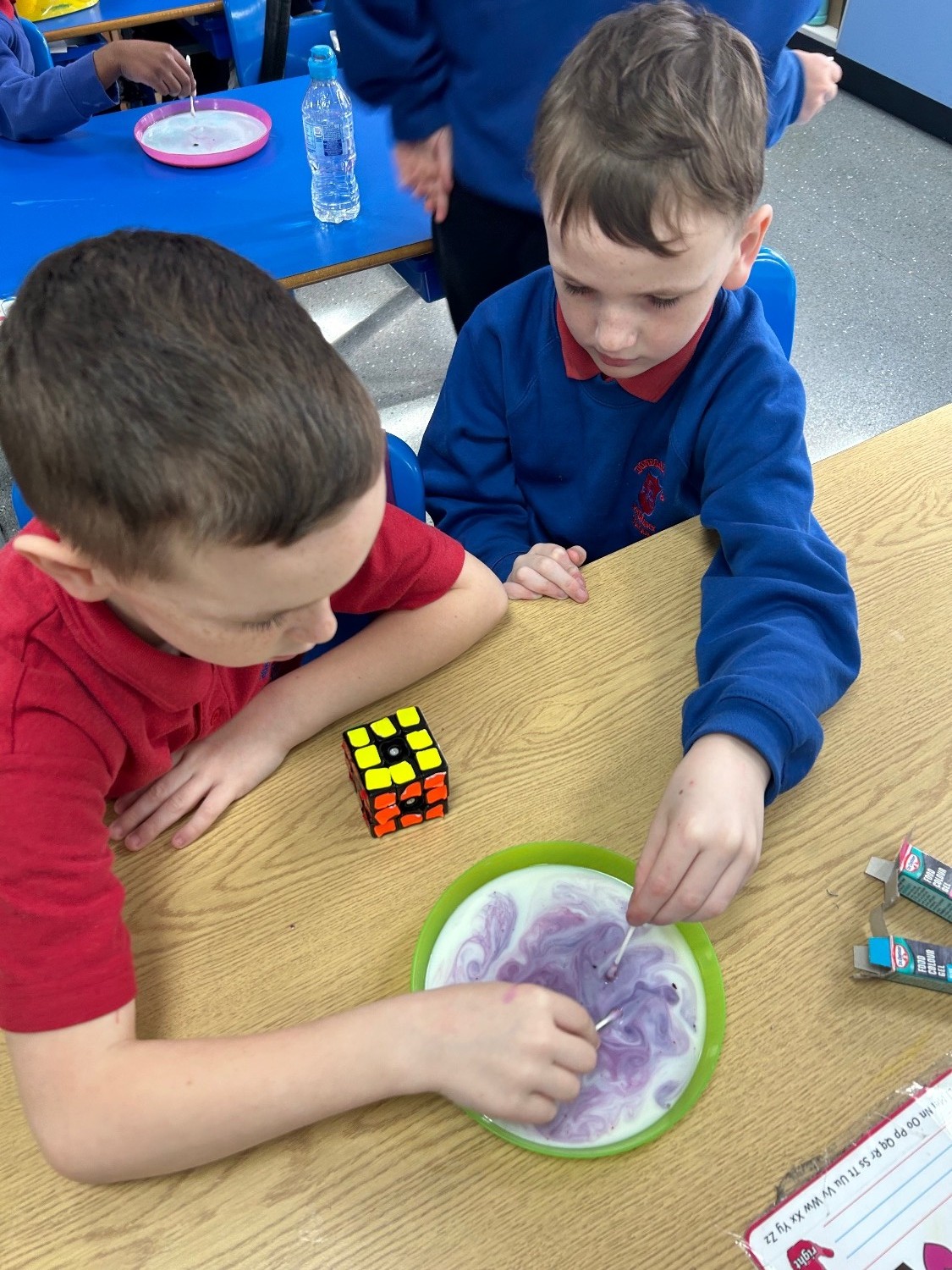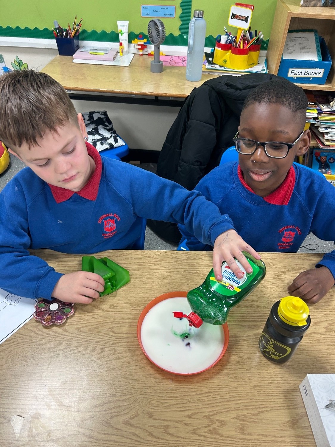 As part of science week, P4 took part in the ‘magic milk’ experiment and discussed how milk is made up of minerals, proteins, and fats. When washing up liquid is added to the milk, the soap molecules run around and try to attach to the fat molecules in the milk. The food colouring allows us to actually see this happen and also creates beautiful shapes and swirls in the process.